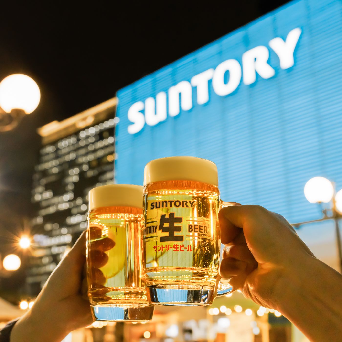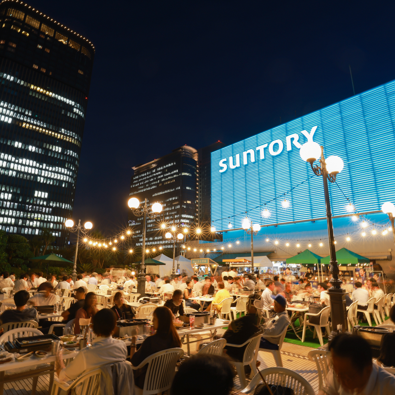 「~夜風と泡のごちそう時間~水色輝く「SUNTORY」の灯りの前で仲間と集う 北海道・沖縄BBQとサントリービールを堪能するビアガーデン 」です。