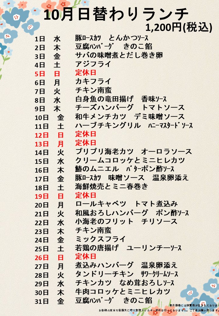 10月の日替わりランチ 1,200円 10月1日(月) 豚ロースカツ とんかつソース 10月2日(火) 豆腐ハンバーグ きのこ餡 10月3日(水) サバの味噌煮とだし巻き卵 10月4日(木) アジフライ 10月5日(金) 定休日 10月6日(土) カキフライ 10月7日(日) チキン南蛮 10月8日(月) 白身魚の竜田揚げ 香味ソース 10月9日(火) チーズハンバーグ トマトソース 10月10日(水) 和牛メンチカツ デミ味噌ソース 10月11日(木) ハーブチキングリル ハニーマスタードソース 10月12日(金) 定休日 10月13日(土) 定休日 10月14日(日) プリプリ海老カツオーロラソース 10月15日(月) クリームコロッケとミニヒレカツ 10月16日(火) 鰆のムニエル バターポン酢ソース 10月17日(水) 豚ロースカツ 味噌ソース 温泉卵添え 10月18日(木) 海鮮焼売とミニ春巻き 10月19日(金) 定休日 10月20日(土) ロールキャベツ トマト煮込み 10月21日(日) 和風おろしハンバーグ ポン酢ソース 10月22日(月) 小海老のフリット チリソース 10月23日(火) チキン南蛮 10月24日(水) ミックスフライ 10月25日(木) 若鶏の唐揚げユーリンチーソース 10月26日(金) 定休日 10月27日(土) 煮込みハンバーグ 温泉卵添え 10月28日(月) タンドリーチキン サワークリームソース 10月29日(火) チキンカツ なめ茸おろしソース 10月30日(水) 牛肉コロッケとミニヒレカツ 10月31日(金) 豆腐ハンバーグ きのこ餡