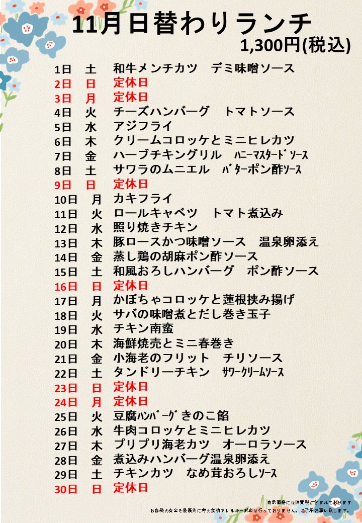 11月の日替わりランチ 1,200円 11月1日(土) 和牛メンチカツ デミ味噌ソース 11月2日(日) 定休日 11月3日(月) 定休日 11月4日(火) チーズハンバーグ トマトソース 11月5日(水) アジフライ 11月6日(木) クリームコロッケとミニヒレカツ 11月7日(金) ハーブチキングリル ハニーマスタードソース 11月8日(土) サワラのムニエル バターポン酢ソース 11月9日(日) 定休日 11月10日(月) カキフライ 11月11日(火) ロールケーキ トマト煮込み 11月12日(水) 照り焼きチキン 11月13日(木) 豚ロースかつ味噌ソース 温泉卵添え 11月14日(金) 蒸し鶏の胡麻ポン酢ソース 11月15日(土) 和風おろしハンバーグ ポン酢ソース 11月16日(日) 定休日 11月17日(月) かぼちゃコロッケと蓮根挟み揚げ 11月18日(火) サバの味噌煮とだし巻き玉子 11月19日(水) チキン南蛮 11月20日(木) 海鮮焼売とミニ春巻き 11月21日(金) 小海老のフリット チリソース 11月22日(土) タンドリーチキンサワークリームソース 11月23日(日) 定休日 11月24日(月) 定休日 11月25日(火) 豆腐ハンバーグきのこ餡 11月26日(水) 牛肉コロッケとミニヒレカツ 11月27日(木) プリプリ海老カツオーロラソース 11月28日(金) 煮込みハンバーグ 温泉卵添え 11月29日(土) チキンカツ なめ茸おろしソース 11月30日(日) 定休日