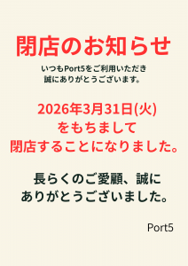 Port5閉店のお知らせ Port5閉店のお知らせ 当店は2026年3月31日(火)をもちまして、閉店することになりました。 皆様には、長らくご愛顧いただき誠にありがとうございました。 Port5スタッフ一同