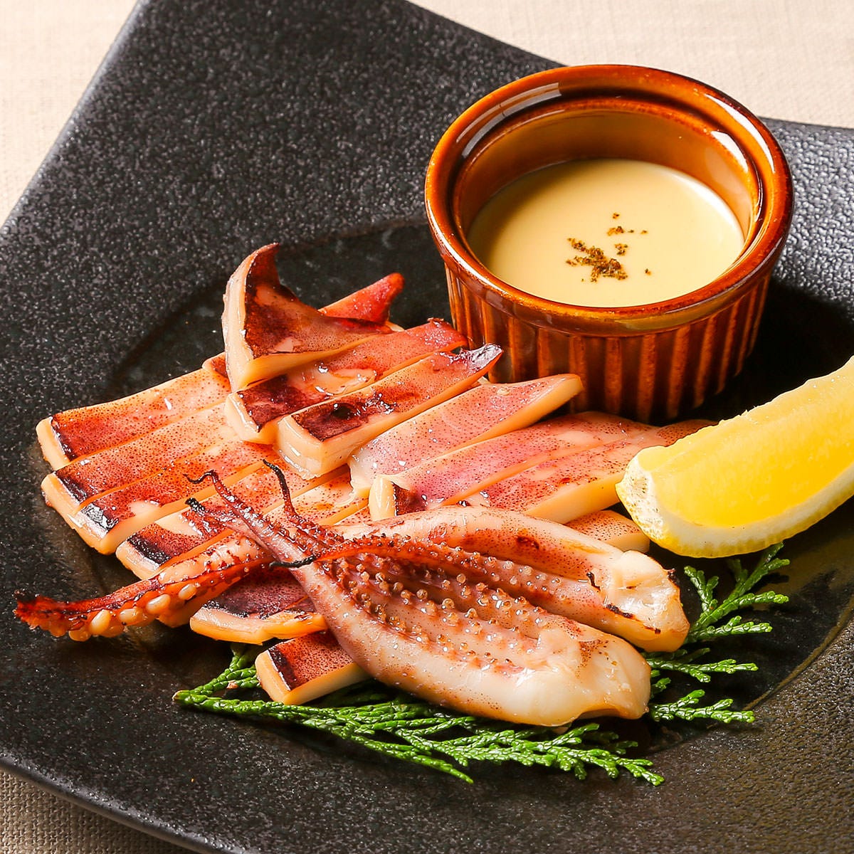 有馬山椒と大葉を合わせたウイスキーに合うソースと一緒にどうぞ。
