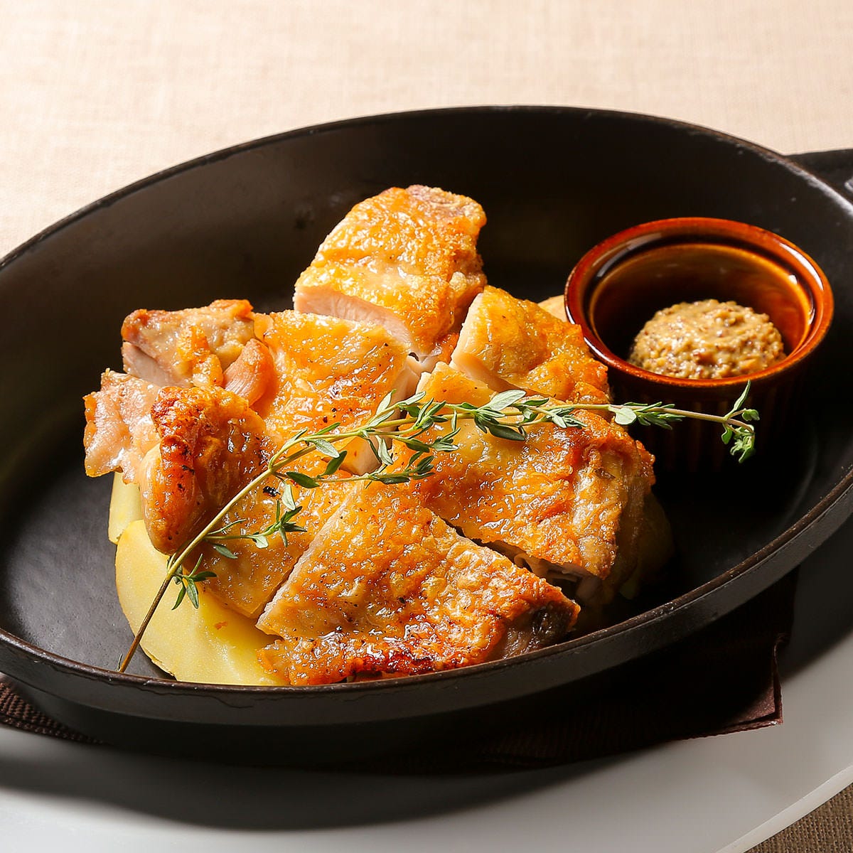 皮目を香ばしく焼いた鶏もも肉をストウブで蒸し焼き。