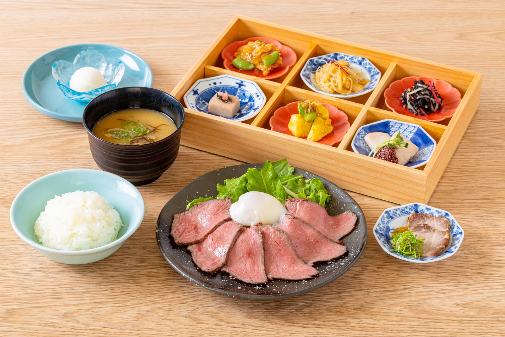 和牛ロースのローストビーフ 山わさびしょうゆで 温泉たまご付き