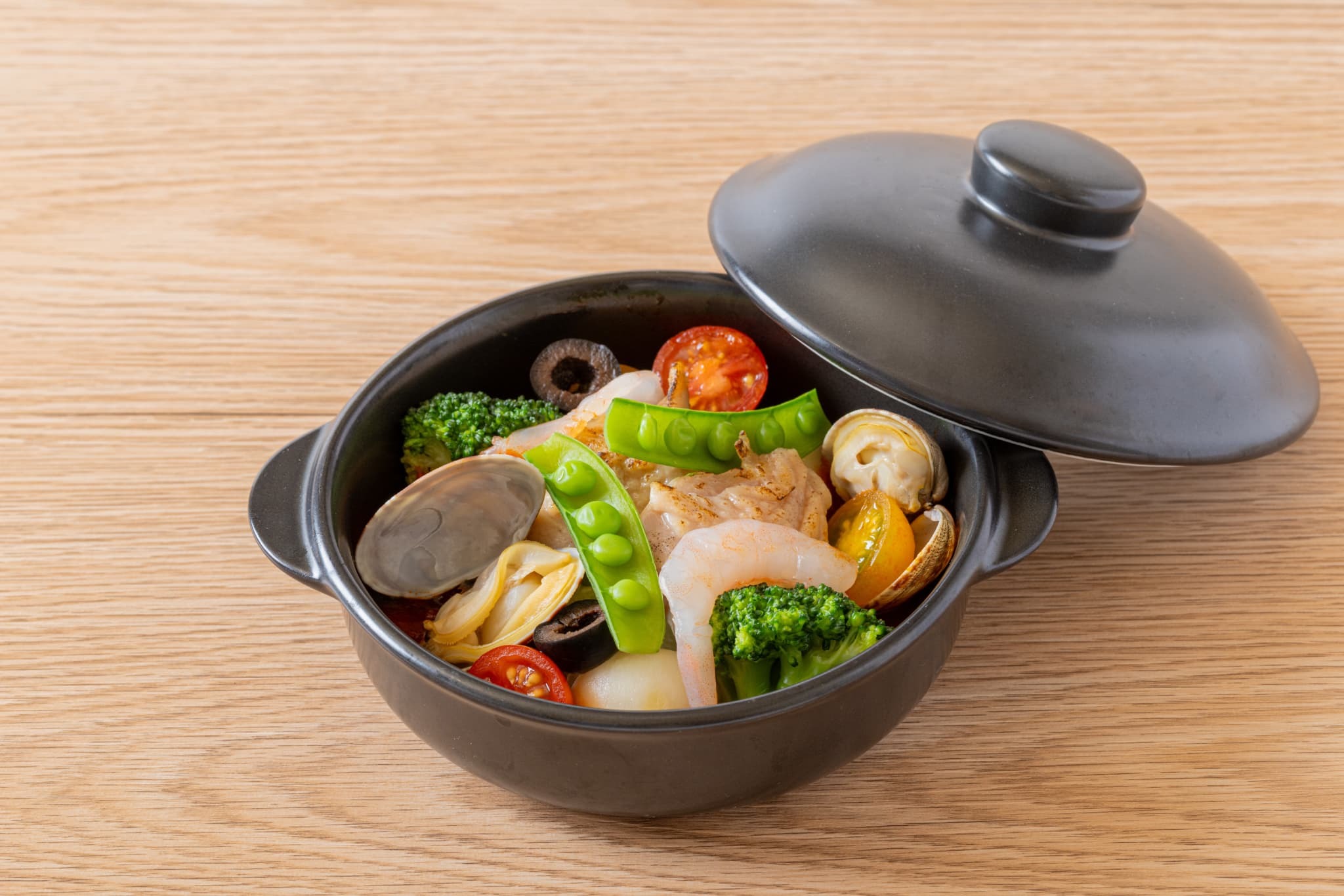 鶏と魚介のうまみがたっぷり入ったトマトベースのアクアパッツァに仕上げました。